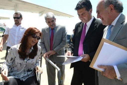 "En Aeroparque me esperaban Aníbal, Coqui y Oscar (Fernández, Capitanich y Parrilli), con las últimas novedades… Tango 01. Rumbo a El Calafate en avión y con silla de ruedas. Ya sabés: fractura de tobillo...", escribió la jefa de Estado, y posteó una foto donde se la ve rodeada de los funcionarios mencionados.