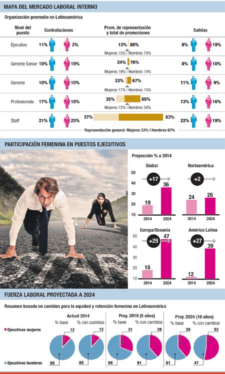 En América Latina, las empresas podrían mostrar un crecimiento significativo en la representación femenina a nivel ejecutivo en la próxima década, con un incremento esperado de un 12% en la actualidad a un 39% en 2024, de acuerdo con el estudio. En tanto que en la región Europa/Oceanía ese porcentaje podría saltar del 18% al 47% en igual período. "La eficacia de las organizaciones para aprovechar el talento femenino va en función de la capacidad para atraerlo, desarrollarlo y retenerlo. El análisis indica que las empresas que confían en ello posee una representación más favorable de mujeres en puestos senior en el largo plazo", sostiene el análisis.