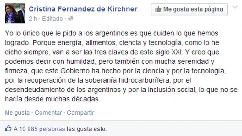 Asimismo, revalidó lo hecho por su gestión en estas áreas: "Podemos decir con humildad, pero también con mucha serenidad y firmeza, que este Gobierno ha hecho por la ciencia y por la tecnología, por la recuperación de la soberanía hidrocarburífera, por el desendeudamiento de los argentinos y por la inclusión social, lo que no se hacía desde muchas décadas".