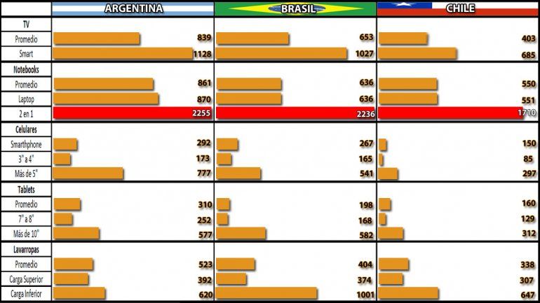 Según GFK, un Smart TV tiene un valor promedio de u$s839 en la Argentina y de u$s403 en Chile. En el país trasandino, el precio de un celular inteligente de alta gama es de u$s297, mientras que en la Argentina sube a unos u$s777. Si la comparación se hace con una tablet, en el mercado local el precio promedio es de u$s310 y en el vecino de u$s160.