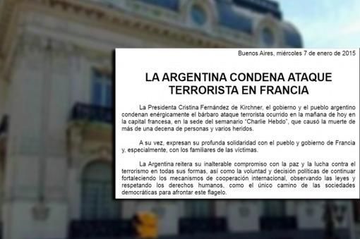 "La Presidenta Cristina Fernández de Kirchner, el gobierno y el pueblo argentino condenan enérgicamente el bárbaro ataque terrorista ocurrido en la mañana de hoy en la capital francesa, en la sede del semanario "Charlie Hebdo”, que causó la muerte de más de una decena de personas y varios heridos.