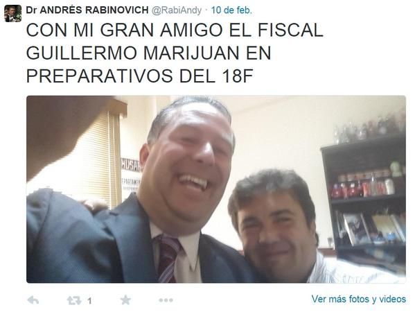 Andrés Rabinovich, confeso amigo del fiscal Guillermo Marijuan, es un ferviente opositor al gobierno nacional. En su cuenta de Twitter, además de hacer gala de su amistad con Marijuan, el abogado del ex jefe de Policia de Santa Fe preso por narcotráfico, suele referirse de manera violenta sobre el kirchnerismo.