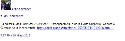 "Si la nota de Roberto Caballero constituye uno de los análisis más lúcidos en relación a la situación institucional del más alto Tribunal, y una investigación de importancia en relación al "quinto hombre” de la Corte, la editorial de Clarín del martes 24 de agosto de 1999 titulada "Preocupante fallo de la Corte Suprema”, es para el Guiness de la incoherencia", afirmó la Presidenta.