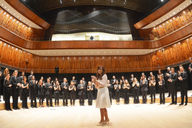 La Presidenta destacó la obra monumental que se realizó para levantar el centro cultural y, entre ellas, enumeró "la Sala Filarmónica, para casi 2.000 espectadores".