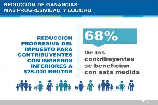 Destacó que "los que cobran menos sueldo van a tener menor reducción", y señaló en el caso de un soltero sin hijos que cobra 15.000 pesos en bruto, tendrá una reducción del 32% en lo que paga hoy de impuesto a las Ganancias.