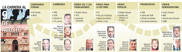 •Cambiemos. El armado opositor que enlaza al PRO, la UCR, la Coalición Cívica (CC) y Fe , entre otros, debuta como marca electoral, gestado en el laboratorio de Jaime Durán Barba con la idea de jugar a la polarización y tensar la discusión entre la continuidad -el FpV en sus dos variables- y el cambio. Asoman, a priori, tres candidatos: Mauricio Macri, Ernesto Sanz y Elisa Carrió, pero el macrismo entiende que eso está supeditado a si el FpV hace, o no, su propia interna. Si no hay PASO K, Macri intentaría ir como único candidato para jugar la disputa del día siguiente de estar entre los dos candidatos más votados.