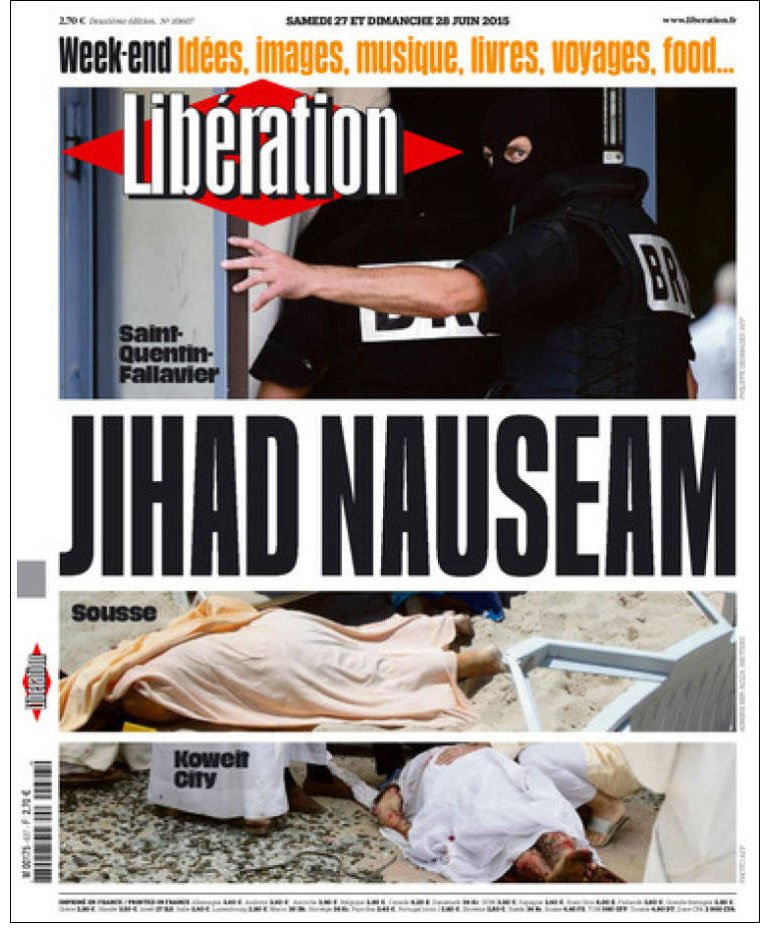 El diario francés Libération fue fiel a su estilo y acompañó tres contundentes fotografías de los ataques y sólo dos palabras condenatorias: "Jihad Nauseam", que podría traducirse como "Nausea Yihadista".