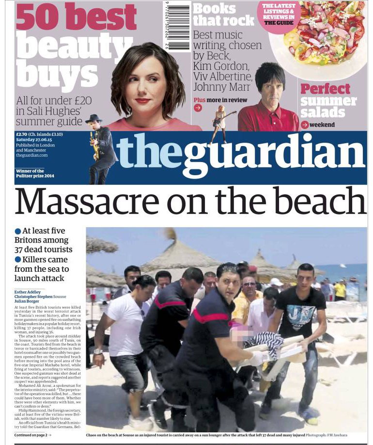 El periódico británico The Guardian tituló contundente: "Masacre en la playa" y dedicó al tema prácticamente toda su portada. Mostró los esfuerzos desesperados de un grupo de enfermeros y rescatistas en uno de los lugares donde se produjo una masacre.