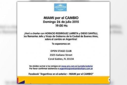 A su vez, los dirigentes del PRO aprovecharon para reunirse con argentinos que habitan la Costa Oeste norteamericana invitados por la asociación "Argentinos en el exterior. Miami por el Cambio”, para exponer sobre la campaña electoral y la victoria del PRO en la CABA, como así también del "futuro" del país con un eventual gobierno de Mauricio Macri, presidenciable del PRO en la alianza "Cambiemos” con la UCR y Coalición Cívica-Ari.
