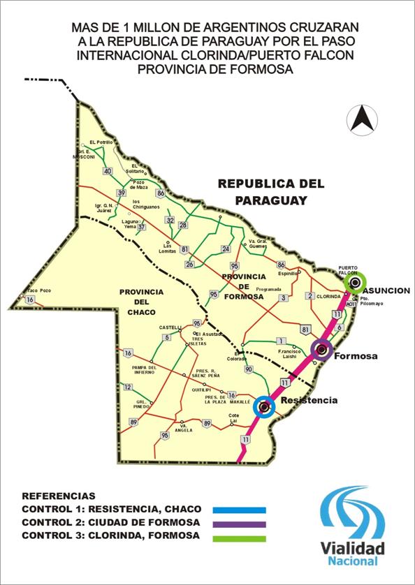 La conexión con el país vecino se realiza por la Ruta Nacional N° 11, que conduce al paso internacional Clorinda, en la provincia de Formosa/Puerto Falcón, en territorio paraguayo, habilitado durante las 24 horas.