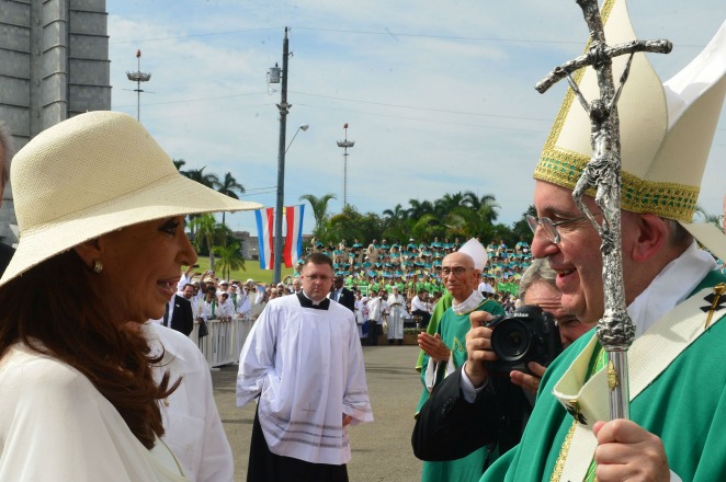 Una vez concluida la multitudinaria ceremonia, que se extendió por más de una hora y media bajo un intenso calor en la capital cubana, la presidenta intercambió saludos y algunas palabras con Francisco, quien momentos antes también había saludado al mandatario cubano.
