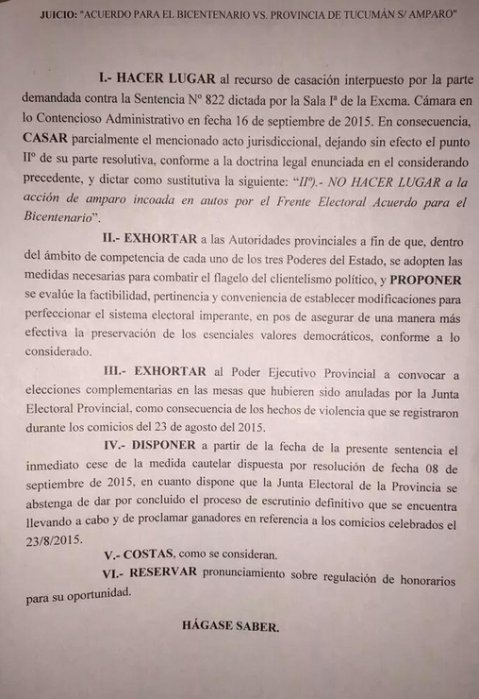 La Corte Suprema de Justicia de Tucumán revocó el fallo de la Sala I de la Cámara Contencioso Administrativa y validó el resultado de las elecciones realizadas el 23 de agosto pasado, que consagraron ganador al candidato del Frente para la Victoria, Juan Manzur.