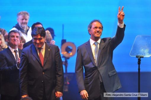 Ante la sala colmada del Teatro Ópera, el candidato a presidente, quien fue el único orador, reconoció la gestión de gobierno del ex presidente Néstor Kirchner y de la presidenta Cristina Fernández de Kirchner y no perdió oportunidad para resaltar las figuras de los ganadores de las elecciones provinciales de Tucumán y de Chaco, Juan Manzur y Domingo Peppo, quienes se encontraban presentes en el escenario.