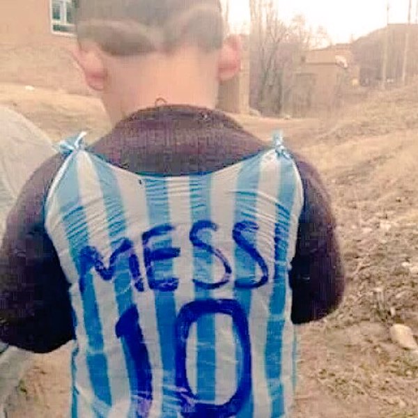 Al no tener las posibilidades económicas de comprarse una camiseta de Argentina con la 10 de Messi, la fabricó por sus propios medios. Con una bolsa y un fibrón azul.