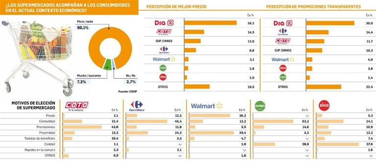Ante la pregunta si los supermercados acompañan a los consumidores en el actual contexto económico, un 90,1% de los encuestados respondió que "no" y sólo un 7,2% consideró que "sí" lo hicieron, "mucho y/o bastante". Dentro de este pequeño número, se destaca claramente Supermercados Día (42,1%), la cadena con capitales españoles que tradicionalmente es la preferida de los sectores más bajos -aunque en la actual coyuntura también buscan posicionarse en barrios ABC1- ya que se caracteriza por tener precios "más económicos" en relación con sus competidores. En el otro extremo aparecen Jumbo (1%), Disco (1,8%) -ambos de la multinacional chilena Cencosud-, y la estadounidense WaltMart (2,3%). Las tres cadenas, además, son las menos valoradas en cuanto a "buenos" precios. Mientras que en la mitad de la tabla, pero más cerca de los peores lugares, se encuentran la cadena argentina Coto (14,5%), los supermercados chinos (8,8%), y la francesa Carrefour (8,6%).