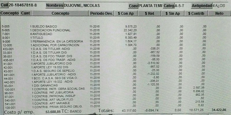 Por la contratación producida en 2012 a pedido del senador radical PRO Luis Petcolff Naidenoff, Dujovne percibe la suma de $43.117,60 en bruto mientras que con los descuentos termina ganando algo más de $34.000 pesos.Cuando asuma como Ministro de Hacienda, el periodista tendrá otro suculento ingreso por parte del Estado.