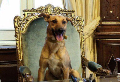 del conductor aparece la foto del perro sentado en el sillón presidencial junto