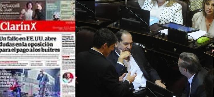 Por su parte Clarín tituló : "Buitres: una decisión de la Justicia de EE.UU. puso en alerta a la oposición sobre la salida del default”, puntualizando que "la Cámara de Apelaciones dejó en suspenso el fallo de Griesa que levantaba los embargos. Todo se define el 4 de abril”.