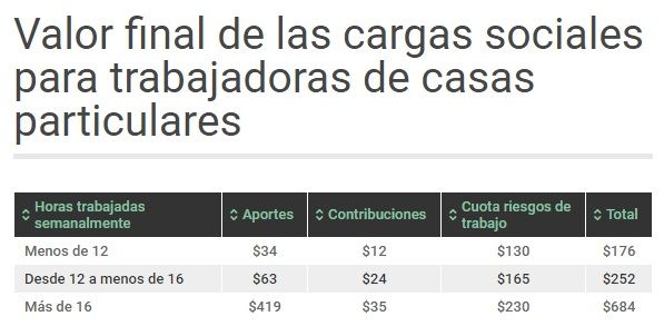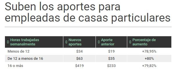 De acuerdo con la nueva escala, las familias que contraten una empleada doméstica por menos de 12 horas semanales los aportes para una empleada doméstica que trabaja menos de 12 horas semanales se irán de $19 a 34 pesos; mientras que para quienes trabajen entre 12 y 16 horassubirán de $35 a 63 pesos. En el caso de aquellas personas que trabajen más de 16 horas, la cifra pasará de $233 a 419 pesos.