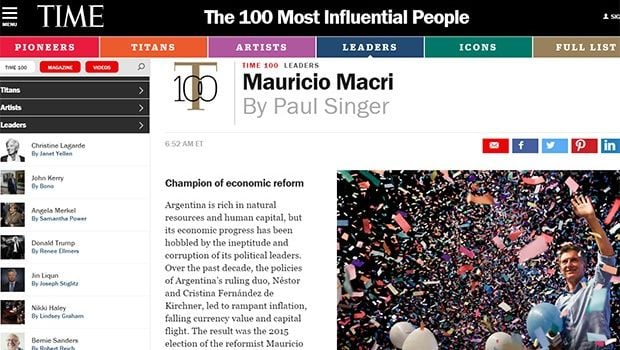 En el título de la mini bio de Macri, Singer describe al presidente como un "campeón de la reforma económica”.