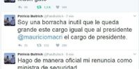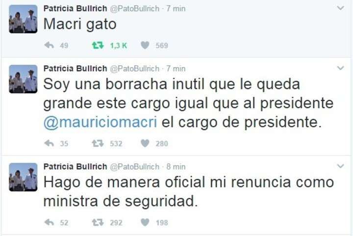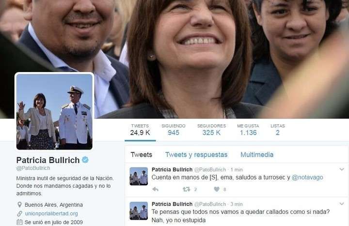 En la información de perfil de la funcionaria los hackers escribieron "ministra inútil de Seguridad de la Nación donde nos mandamos cagadas y no lo admitimos" y entre los mensajes, escribieron: "Soy una borracha inútil que le queda grande este cargo igual que al presidente Mauricio Macri".