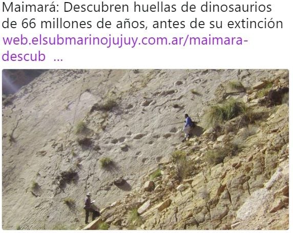 Huellas de dinosaurios saurópodos y terópodos y de aves del último período del Cretácico fueron descubiertas en la localidad jujeña de Maimará, en la Quebrada de Humahuaca, por investigadores de las universidades de Salta, Tucumán y Río Negro, como indicios de la existencia de "un mar de poca profundidad" pero con miles de kilómetros cuadrados de extensión, reveló hoy a Télam el investigador del Conicet Carlos Cónsole Gonella.