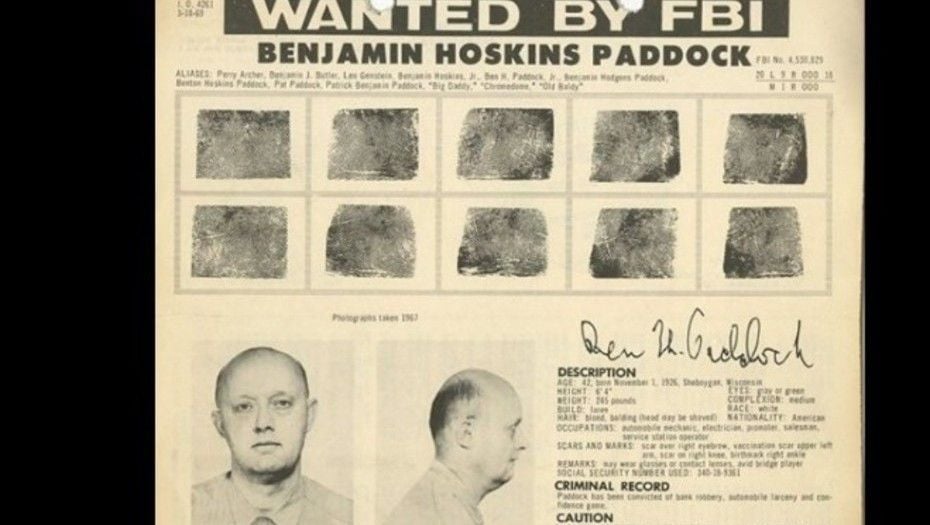 Es que Benjamin Hoskins Paddock fue un ladrón de bancos en serie que terminó en la lista de los más buscados por el FBI desde 1969, cuando escapó de una prisión federal en Texas mientras cumplía una sentencia de 20 años, hasta 1978, cuando fue arrestado.