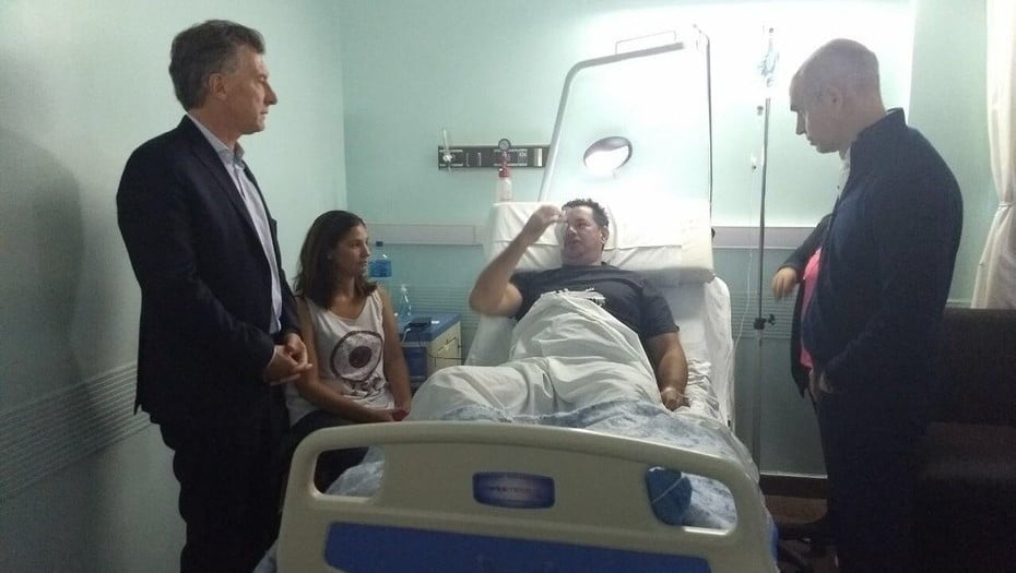 El presidente Mauricio Macri visitó al oficial de la Policía de la Ciudad de Buenos Aires, Maximiliano Russo, quien lucha por no perder su ojo derecho golpeado por un objeto contundente y pequeño, que podría ser un tornillo y que le rompió parte de la córnea.