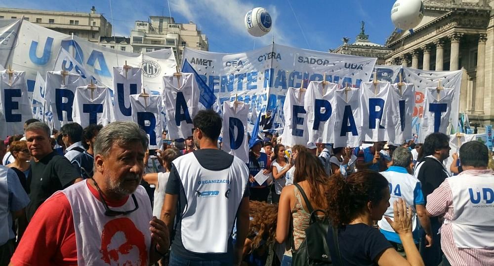 Miles de docentes realizan una multitudinaria manifestación en el centro porteño. Reunidos en la Plaza del Congreso los manifestantes se desplazan hacia el ministerio de Educación, en el inicio del paro que realizarán por 48 horas, en reclamo de un ajuste salarial para compensar la elevada inflación del 2016.