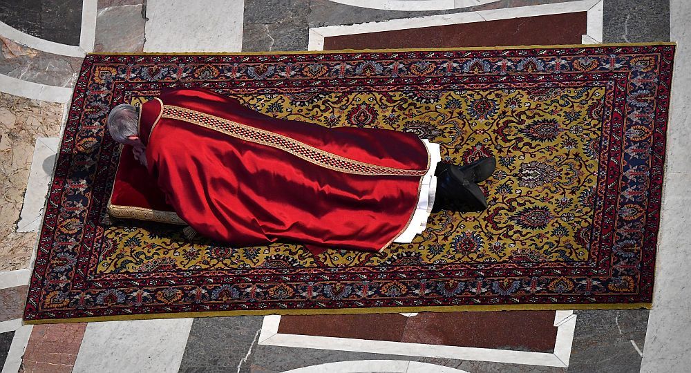 Varias veces durante el servicio religioso, Francisco inclinó su cabeza en una reflexión silenciosa.