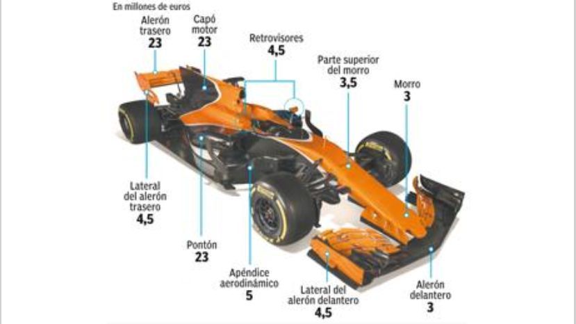 Así, el capot motor, los pontones y el alerón trasero de los F1 son las zonas más caras para anunciar, ya que la tarifa media asciende a los 23 millones de euros (u$s 25 millones). La diferencia con el resto del monoplaza es enorme, ya que es en estos espacios donde los grandes equipos concentran a los patrocinadores que más aportan a su presupuesto. A continuación se encuentran los apéndices aerodinámicos que se sitúan entre las ruedas delanteras y las entradas de aire del radiador, que presentan un precio medio de 5 millones. Le siguen los retrovisores y los laterales de las alas delantera y trasera (4,5 millones), la parte superior del coche que va desde la cabina del piloto a la mitad del morro (3,5 millones) y, por último, el morro y el alerón delantero (3 millones).