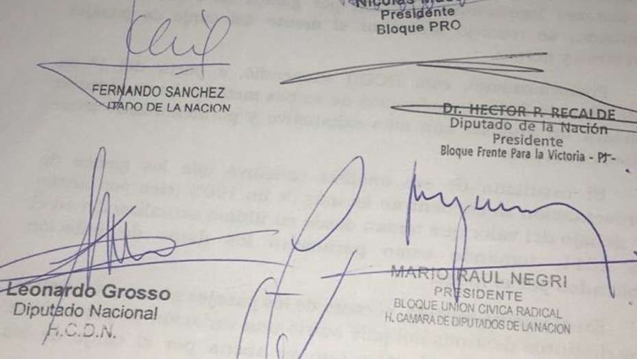 Esa resolución la firmaron el titular del bloque PRO, Nicolás Massot; el del Frente para la Victoria (kirchnerismo) Héctor Recalde; Fernando Sánchez (ARI), Mario Raúl Negri (UCR), Leonardo Grosso (Movimiento Evita) y Franco Caviglia, diputado que responde al bonaerense Darío Giustozzi. No firmaron el pedido el bloque de Sergio Massa y el unibloque que conforma Margarita Stolbizer, en discrepancia con darse un aumento en este momento.