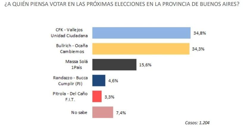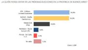 La consultora apuntó que la boleta de Kirchner-Vallejos se impone en el GBA por 38% a 31% de la de Bullrich-Ocaña, mientras que el resto de la provincia "ganan” los candidatos de Cambiemos con 41% aventajan a los del Frente para la Victoria.