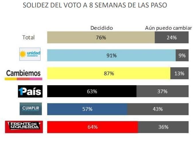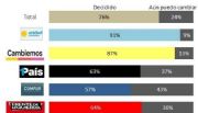 Entre los votantes de Cristina, más del 90% dicen tener su voto completamente decidido, y un porcentaje similar (87%) de los votantes de Cambiemos dice lo mismo. Entre los que anticiparon que votarán a Massa y al FIT, la relación es de 6,3 de cada 10. En el total, 76% dice tener su voto ya decidido y 24% admite que aún puede cambiarlo.