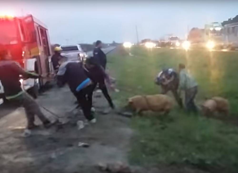 El saqueo fue filmado por testigos que no podían creer lo que veían: ante la mirada de policías, los vecinos de chacras aledañas comenzaron a arrastrar a los chanchos hasta sus propios vehículos.