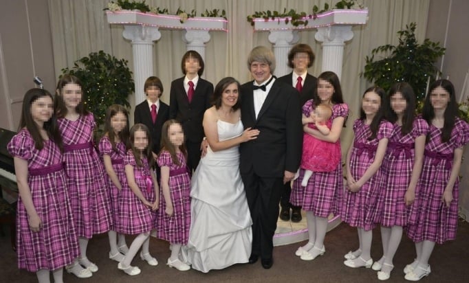 Louise Turpin lleva un largo vestido blanco, su marido un traje y están rodeados por 13 niños o jóvenes. Las niñas, de pelo largo y castaño, llevan el mismo vestido púrpura con estampado escocés, excepto una bebé vestida de fucsia. Los niños, en tanto, usan el mismo peinado taza que David Turpin.