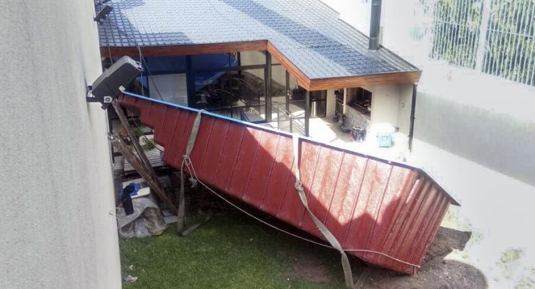 Una de las barras de contención que sostenían a la piscina se venció por el peso de la piscina prefabricada y el brazo hidraúlico de la grúa se desplomó.