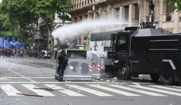 En respuesta, efectivos de la Guardia de Infantería de la Policía disparó balas de goma y gases lacrimógenos, al tiempo que tiró agua con un camión hidrante. Las escenas de máxima tensión se extendieron por una hora, en la que hubo corridas y contenedores de basura quemados, en la intersección de las avenidas Rivadavia y Callao.