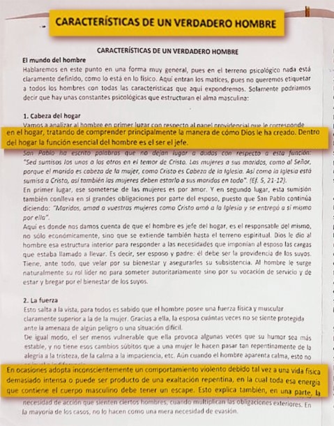 En el mismo apunte se habla del hombre como "cabeza del hogar", donde la función esencial es "ser el jefe". Además se habla del hombre como responsable de la casa "no sólo económicamente" sino también en el plano espiritual.