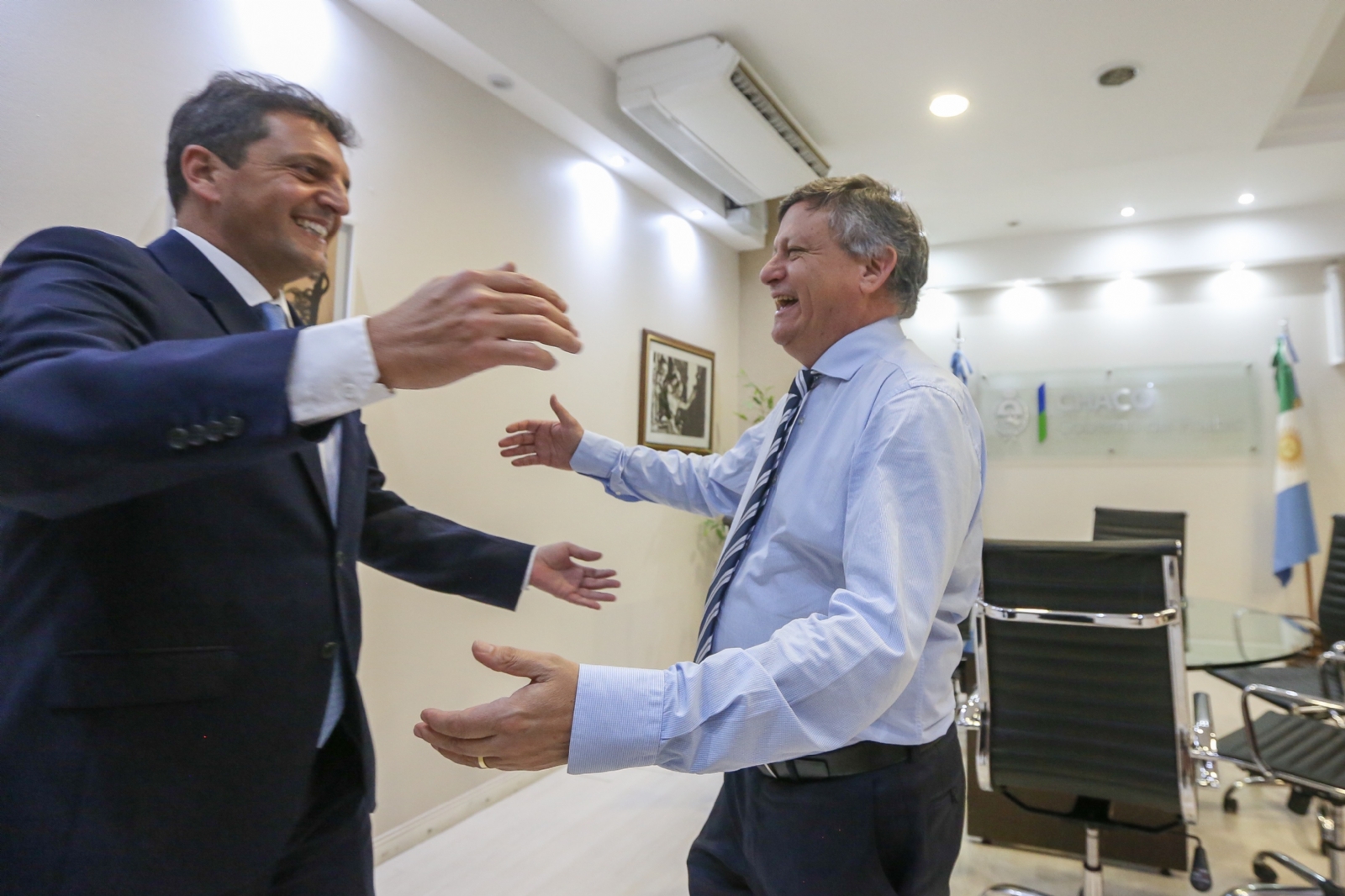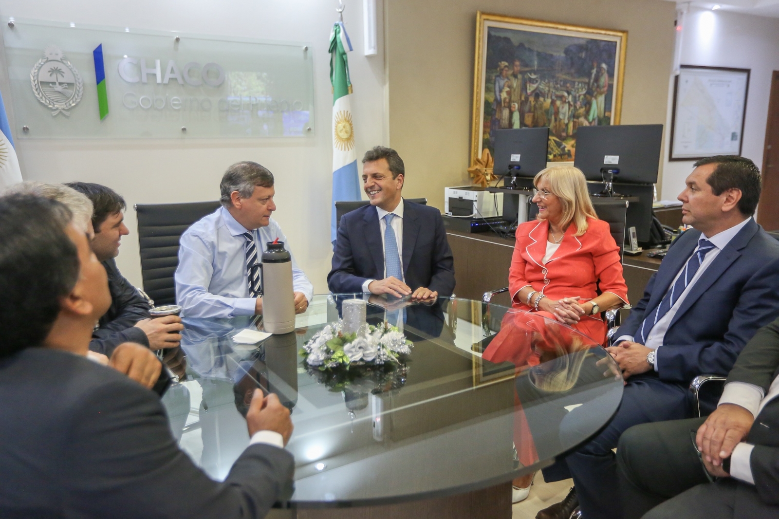 Tras haber sido recibido por el gobernador Domingo Peppo en la Casa de Gobierno de Chaco, y haber compartido un encuentro con los diputados Juan Mosquera y Elda Pértile, el Ministro de Hacienda y Finanzas de la Provincia del Chaco, Cristian Ocampo, y el referente del FR José Sánchez, Sergio Massa felicitó al gobierno local por el programa de microcréditos “Mi Proyecto” organizado por la Gobernación para la Provincia.