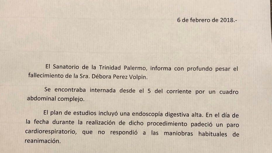 "El plan de estudios incluyó una endoscopia digestiva alta. En el día de la fecha durante la realización de dicho procedimiento pareció un paro cardiorespiratorio, que no respondió a las maniobras habituales de reanimación", concluye el comunicado oficial, y envía las condolencias a la familia.
