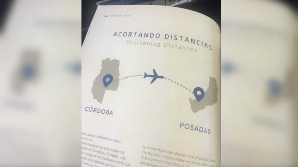 El artículo "Acortando distancias" estaba destinado a exaltar las virtudes del servicio entre la ciudad de Córdoba y la de Posadas, en Misiones, pero en vez de aparecer la provincia de las sierras apareció la de las montañas.