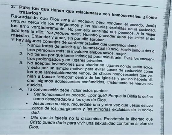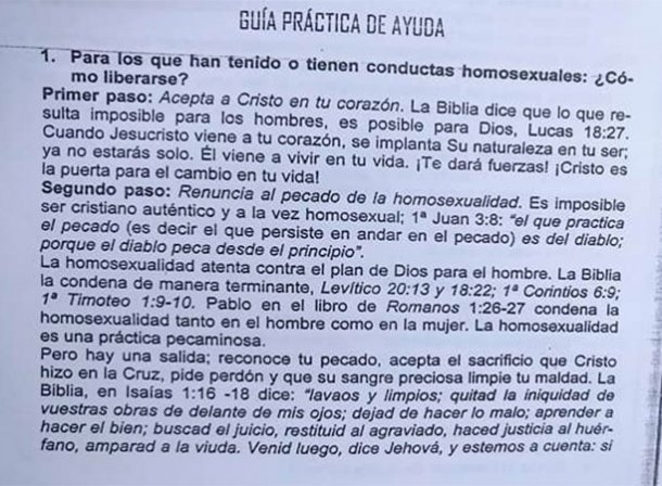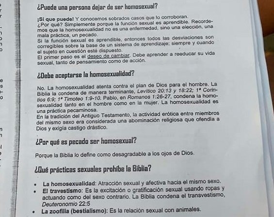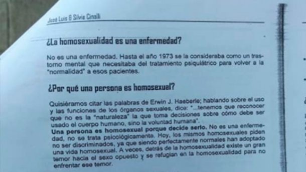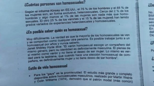 "La homosexualidad es una práctica pecaminosa" que "atenta contra el plan de Dios" y "una abominación religiosa". Los conceptos forman parte de un material redactado por un pastor y que pretendía utilizar un colegio evangélico de la ciudad de Paraná para las clases de educación sexual.