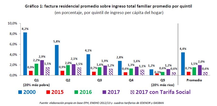 Según un informe elaborado por el Gobierno, para todos los niveles de ingreso, se observa que la participación de las facturas de gas y electricidad en el ingreso promedio de un hogar es menor en 2017 que en 2000, aún si no se tiene en cuenta la existencia de la Tarifa Social Federal (TSF).