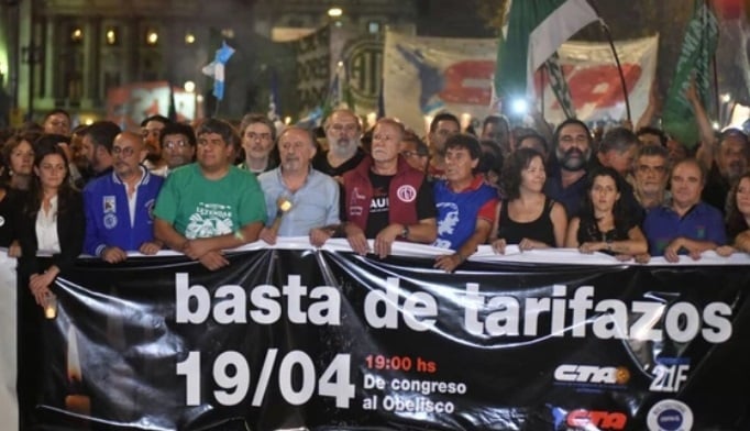 La movilización fue anunciada la semana pasada durante una conferencia de prensa que compartieron en el Hotel Bauen los líderes de esos espacios, Hugo Yasky; Pablo Micheli y Pablo Moyano, junto a líderes de organizaciones de defensa del consumidor, que integran la denominada "Multisectorial contra el Tarifazo".