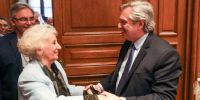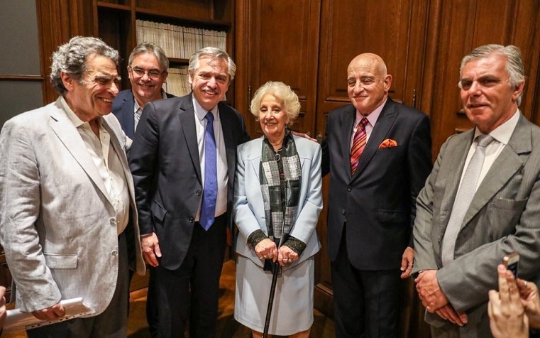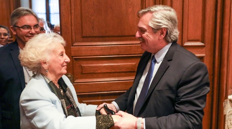 Estela de Carlotto, Victoria Tolosa Paz y Alberto Fernández. La UNTREF decidió distinguir a Carlotto por "su activismo infatigable en la búsqueda de las nietas y nietos apropiados con alteración de su identidad" durante la última dictadura cívico-militar.