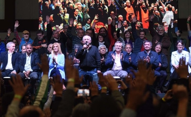 “Delante de todos ellos quiero poner en consideración del plenario nacional de la CTA la siguiente moción, que votarla con el cerebro pero hay que votarla con el corazón. Apostar al fortalecimiento del campo popular y de la lucha de la clase trabajadora que venimos impulsando en todo el país. Dando mandato a la comisión ejecutiva de la CTA de los trabajadores para iniciar el proceso de unificación con la CGT”, dijo Hugo Yasky. Por unanimidad, se votó el respaldo a la fórmula presidencial que encabeza Alberto Fernández.