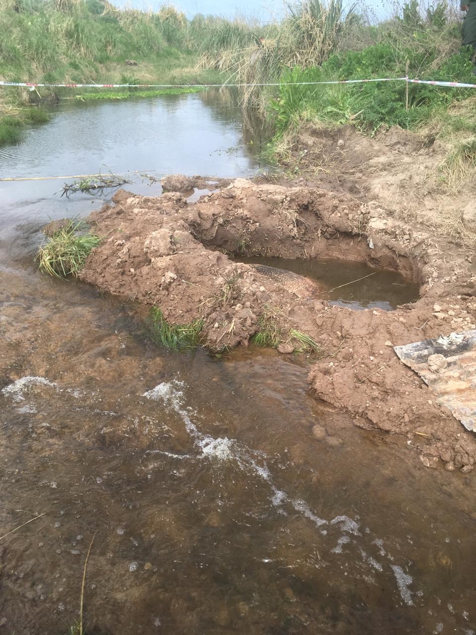 El paleontólogo Esteban Soibelzon comentó que trabajaron con el municipio de Ezeiza, quienes pusieron máquinas y personal a disposición para poder rescatar el fósil que estaba dentro del cauce de un arroyo y había sido encontrado ocasionalmente por vecinos mientras pescaban. “Lo primero que debimos hacer es desviar el cauce del arroyo unos metros, para poder trabajar en seco”, explicó.