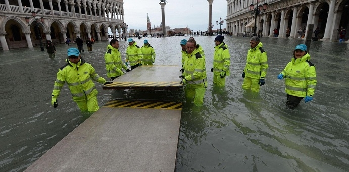 A las 13 de este domingo (las 9 en la Argentina), se registró el pico más alto, que obligó a levantar los tablones de madera sobreelevados que se convierten en las rutas para venecianos y los turistas que siguen llegando.