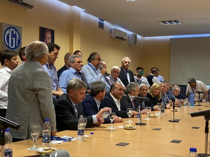 Sentado entre los dos secretarios generales de la CGT, Héctor Daer y Carlos Acuña, Fernández dejó un claro gesto de apoyo a la CGT, al afirmar que formará parte del próximo gobierno.